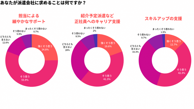 今回のアンケート調査により、派遣社員の多くが働く意欲を高く持っているにもかかわらず、フォロー不足・キャリアとスキルの支援不足・求人不足を感じていることが明確になりました。