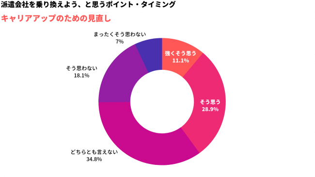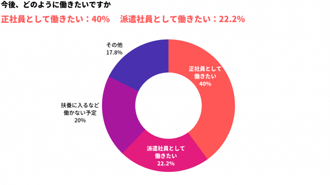 今後の働き方については、40%は「正社員として働きたい」と答え、派遣会社を乗り換えるポイントに関しては、40%が「キャリアアップのため見直し」にという回答。